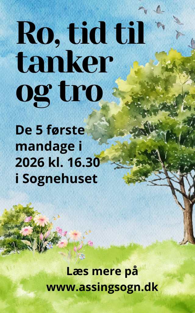 Dette er et pop-up arrangement og tænkt som en pause fra hverdagens travlhed. Det bliver en halv time med tid til ro og eftertanke og foregår de 5 første mandage i 2026. Vi mødes i Assing Kirkes Sognehus.